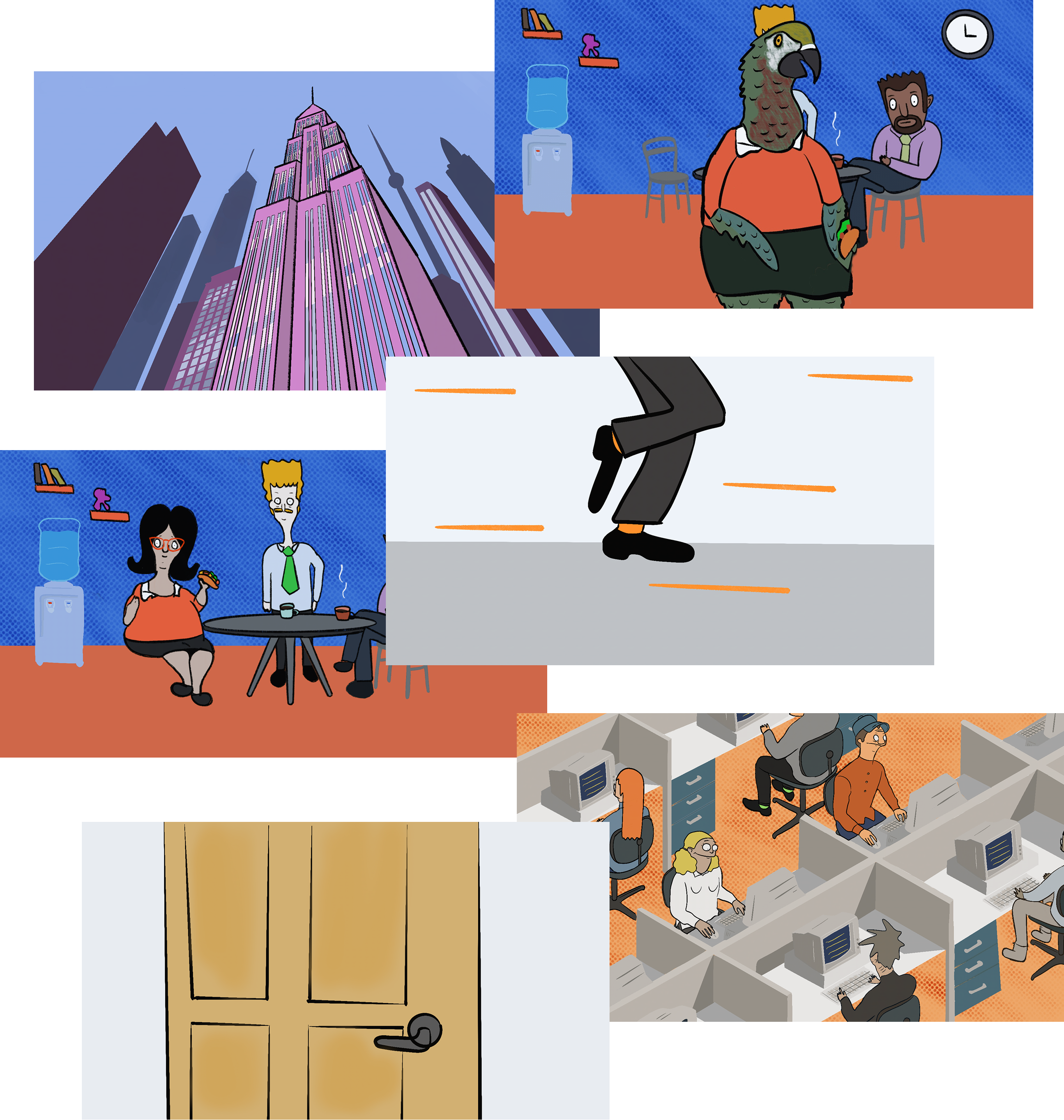 "Employe of the Month" marks my first experience with animation using illustration. The project involved a detailed process, including character design, narrative development, and the strategic planning of camera angles. Its goal was to craft a cohesive and engaging visual story. The work explores the use of visual metaphors, dynamic motion, and symbolism to portray a distinctive journey of self-realization.